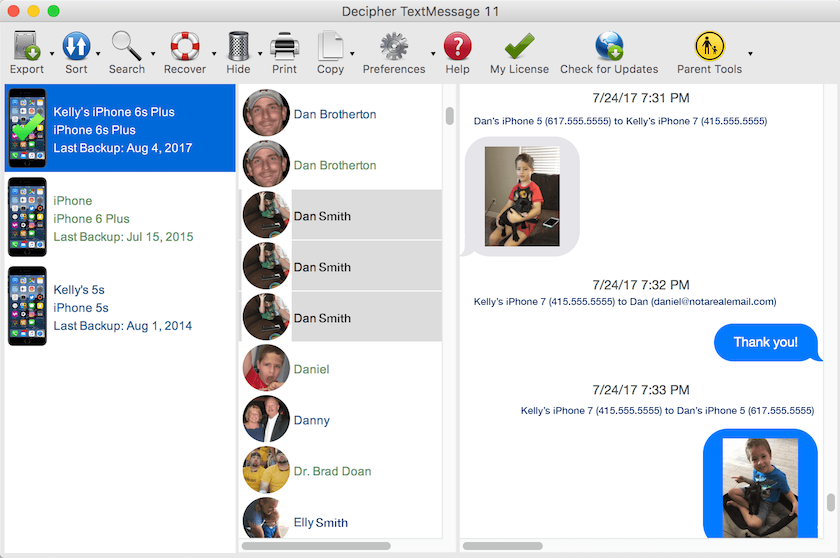 In the right side of the Decipher TextMessage window, you'll see your combined text message conversations ordered by date and time. Each message is labeled with both the sender and the receiver.